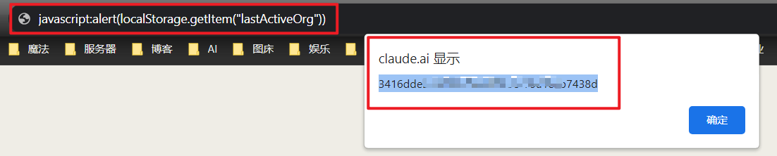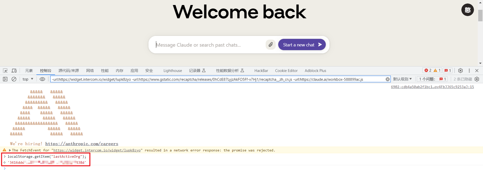 访问 https://claude.ai 登录你的账号,按下F12,点击控制台(Console),复制下面代码并回车,即可获得OrganizationId。