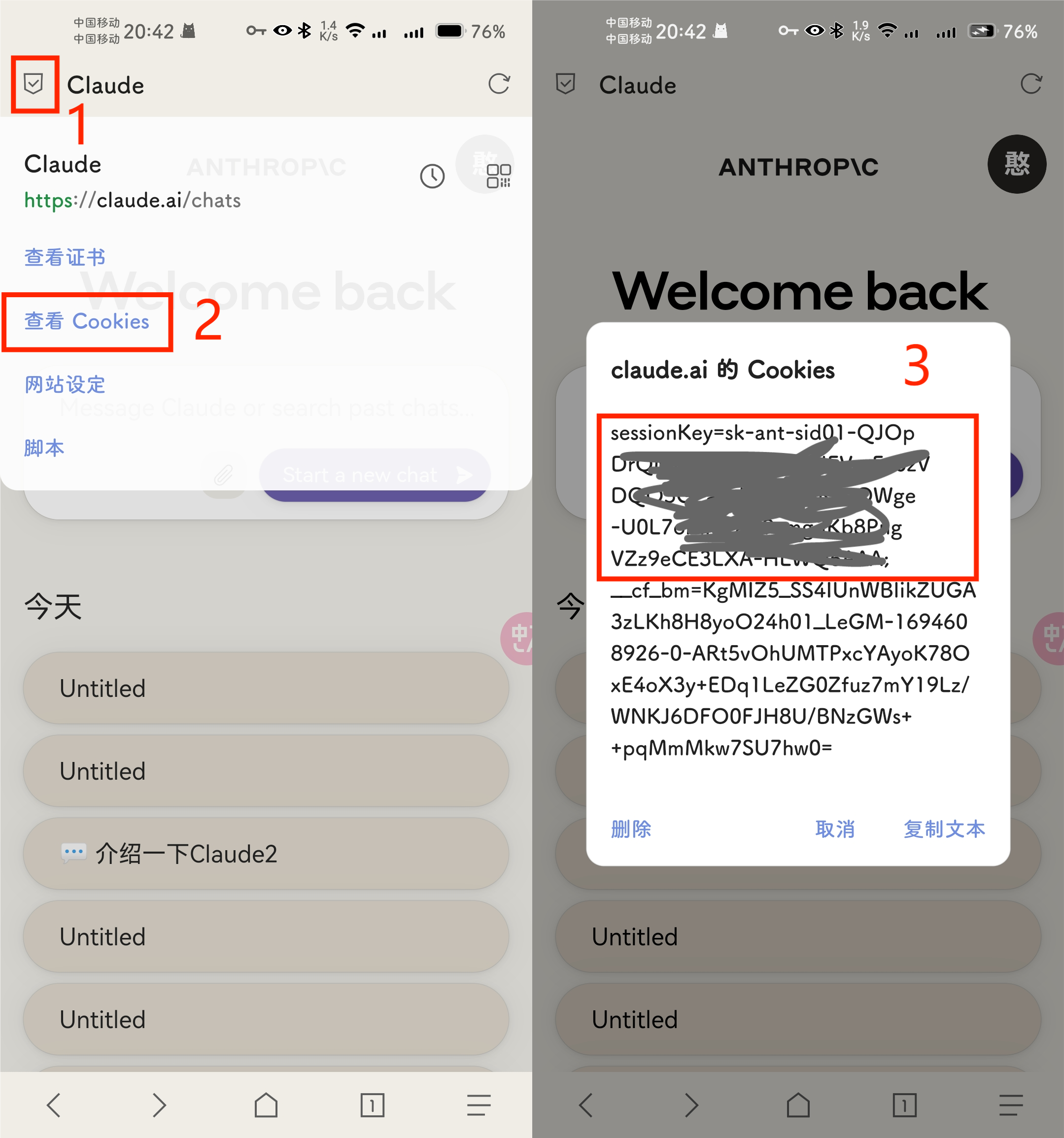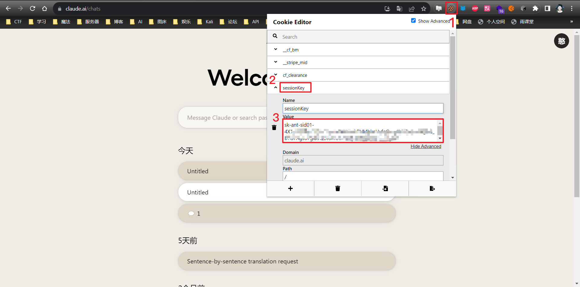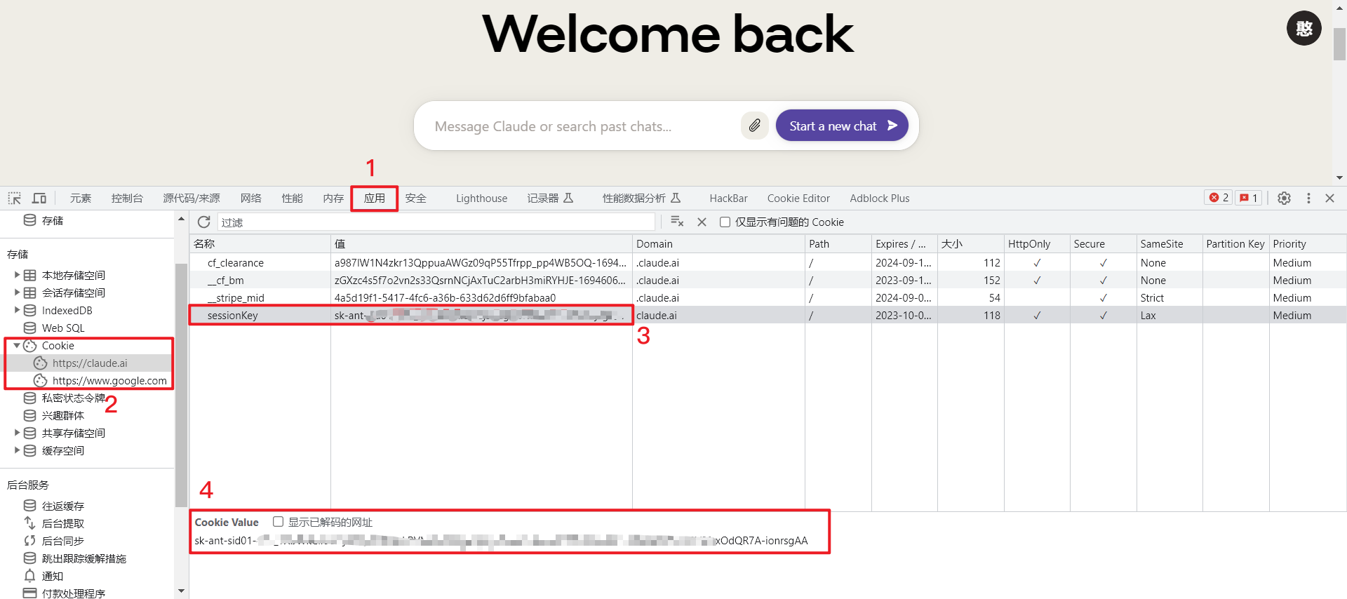 登录账号按F12或直接打开开发者模式,点击应用(应用程序,Application),在左侧存储中点击Cookies,展开找到https://claude.ai 项,在右侧列表找到sessionKey,复制它的值。