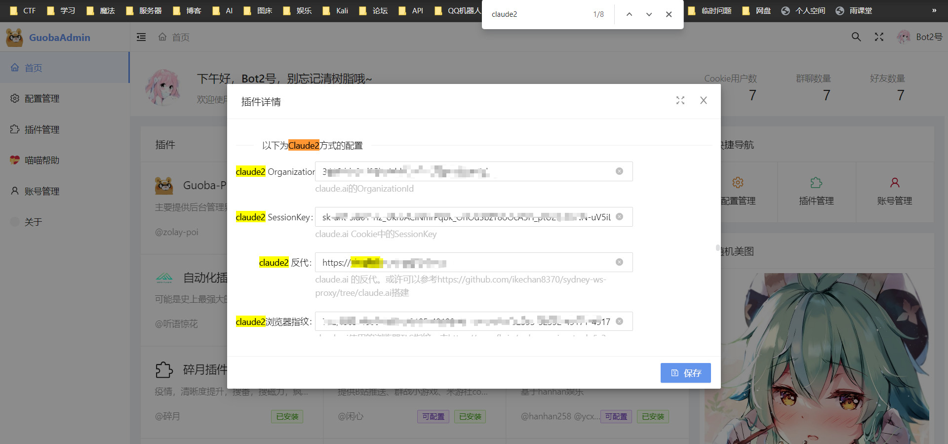 登录锅巴,Ctrl + F搜索Claude2,填写上面获得的信息,填写完成点击保存即可。